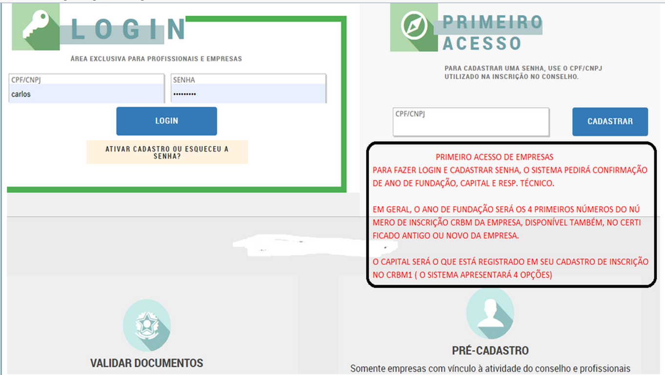 As empresas que estão inscritas no CRBM1 e ainda não fizeram o acesso ao novo serviços online necessitam inicialmente acessar os serviços online através do PRIMEIRO ACESSO.