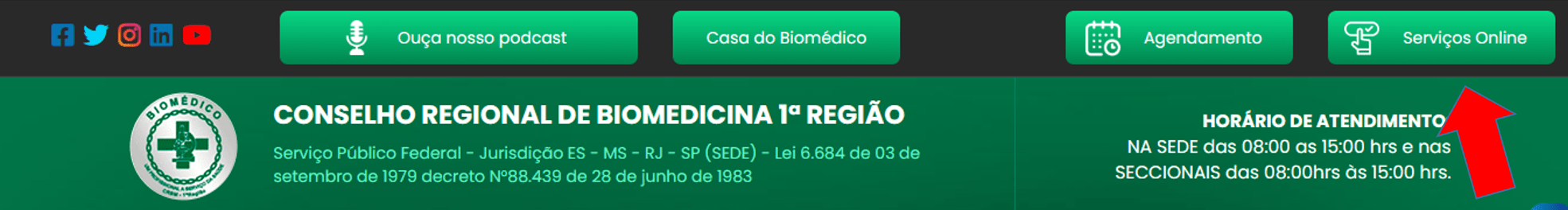 1) Acesse serviços online em um dos botões da página inicial do site do CRBM1, https://crbm1.gov.br, clicando no botão a direita como a imagem abaixo.